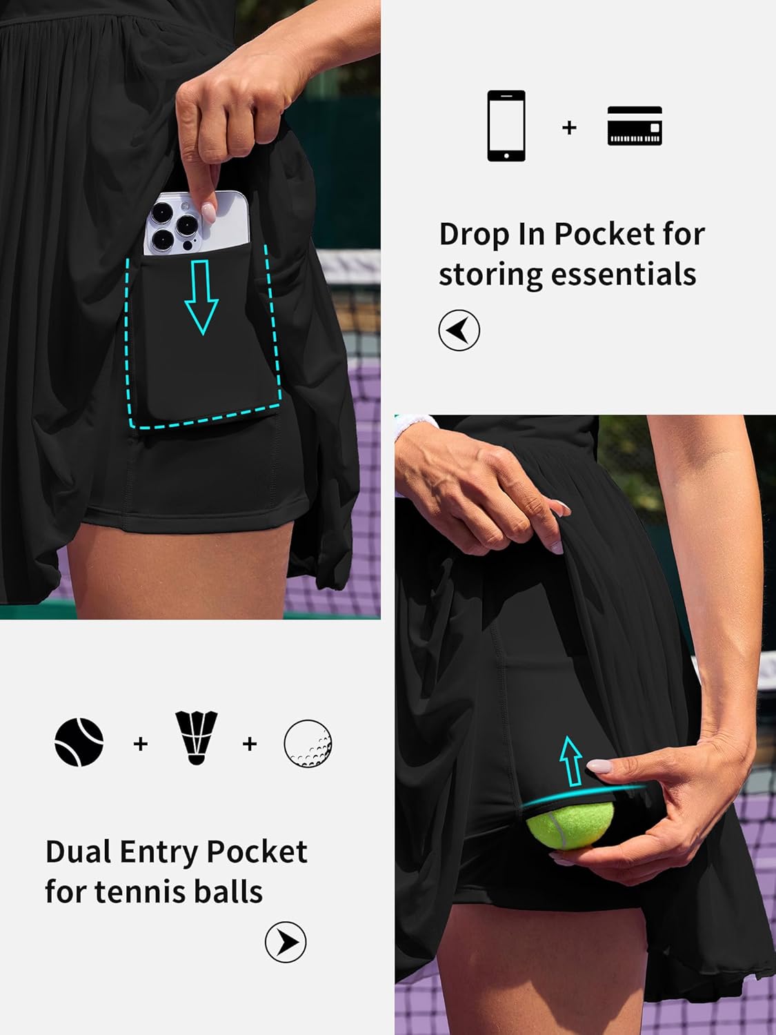 - Built-in Shorts with Pockets: Our athletic dress comes with separate shorts for easier wear. The built-in shorts have pockets for carrying your phone and tennis balls